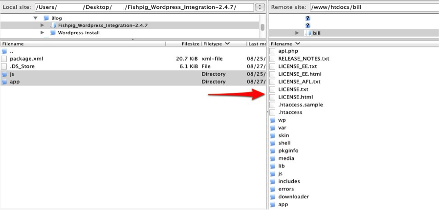 When installing extensions, my preferred method is to use FTP to accomplish the installation. I’m a big fan of having a GUI and being able to drag and drop. To begin the installation, open a connection with an FTP program such as FileZilla. Navigate your Local Site to the folder where the extracted FishPig extension is located. Then, navigate you Remote Site to the root folder of your Magento installation. Simply drag all of the FishPig folders in the root Magento folder and let FileZilla go to work placing all the files and folders in their correct locations.