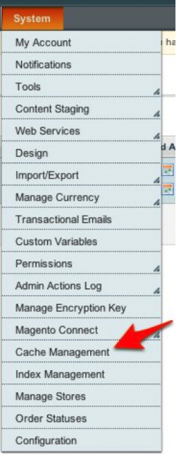 When the files have completed transferring, you will need to log into the Magento Admin and clear out the cache. To do this, navigate to System > Cache Management.