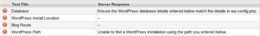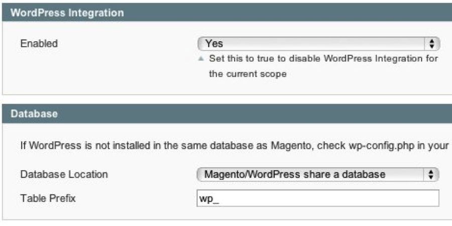 Currently, this table doesn’t look too appealing since the configuration has not been completed yet. Let’s begin by taking care of the Database & WordPress Install Location rows of this table. You will want to set WordPress Integration Enabled to ‘Yes’. You will then see the ‘Database’ block that contains a dropdown for ‘Database Location’ & ‘Table Prefix’. The WordPress installation that was done previously has Magento and WordPress sharing the database so we want to make sure we select ‘Magento/WordPress share a database’. In some cases, they will not share a database. Next, it is important that you set the Table Prefix field to exactly what you did during your WordPress install.