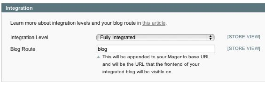 Our next step is to set up the Integration Level and Blog Route. An extremely useful feature within FishPig is that you can fully integrate your Magento theme into your WordPress blog. To do this, set the Integration Level to ‘Fully Integrated’. On the other hand, if you plan to use different themes for Magento and WordPress you have the option to set the Integration Level to ‘Semi Integrated’. Now that we have our Integration Level set, we need to determine what we want the blog route to be. What we enter here will be appended to our base Magento URL, so choose wisely since your customers and guests will see this when they visit your blog.