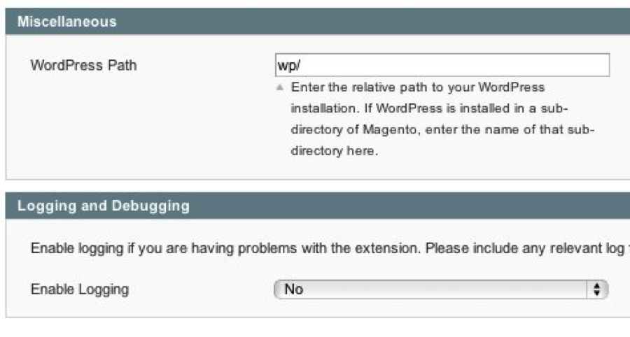 The last two areas of the Integration page are Miscellaneous & Logging and Debugging. Under Miscellaneous, we have a field for WordPress Path. This needs to have the location of your WordPress installation. I have set mine up in a folder called ‘wp/’ which is located in the root of my Magento installation. This may be different depending on how you installed WordPress in relation to Magento.