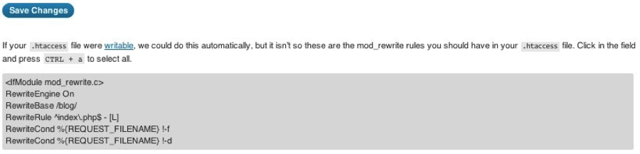 You will see several different options that allow you to pick how you want your URL structure for WordPress posts to be displayed. Once you have selected an option, click ‘Save Changes’. You will see a gray box appear at the bottom of the page that will have several lines of text in it.